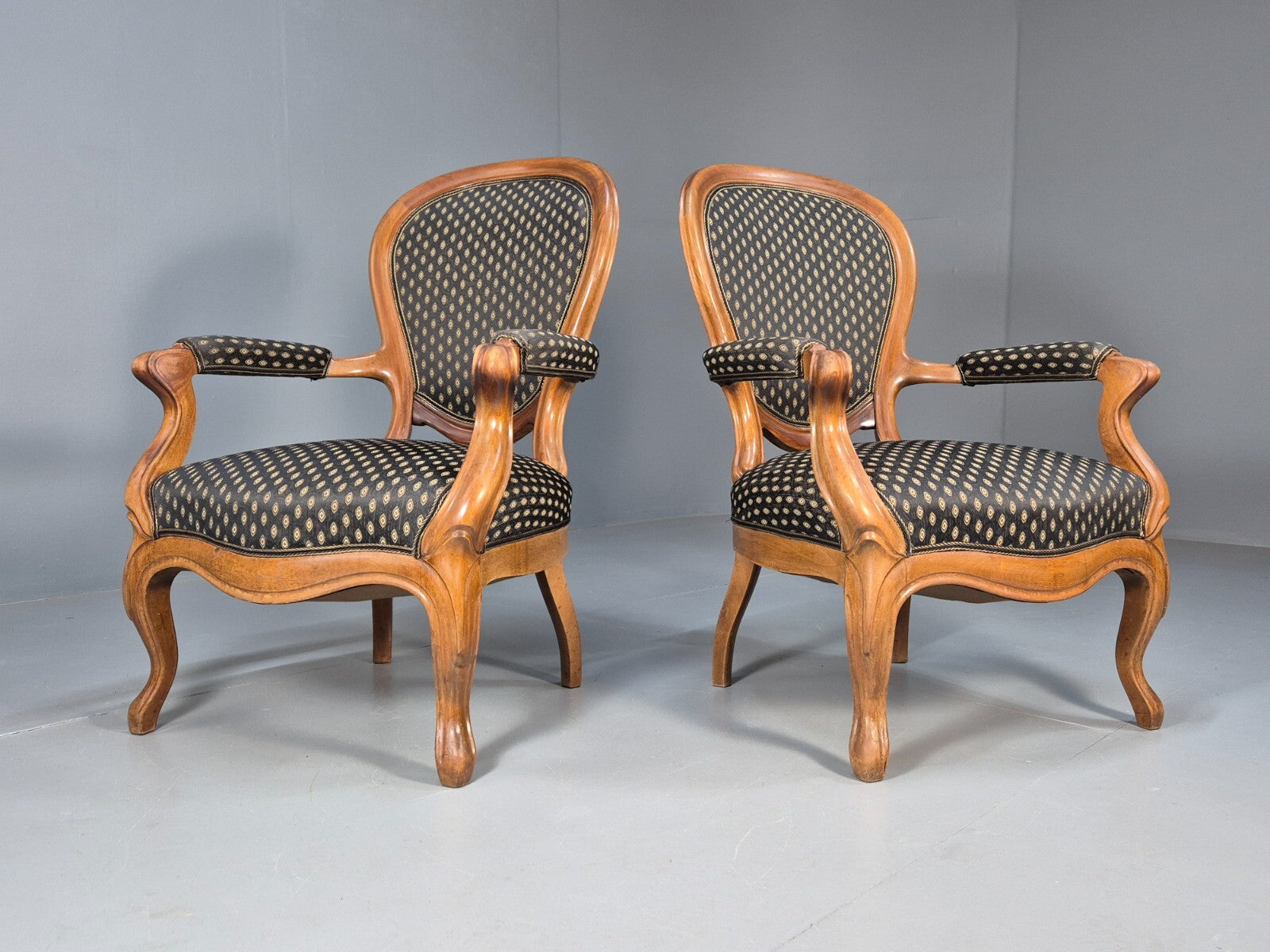 Antique Mahogany Armchair Pair Black Pattern Fabric Louis XV Style EB9558 VCLO
