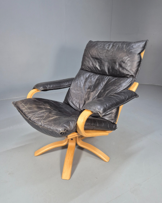 1x Vintage Danish Leather Swivel Armchair 1980s Blonde and Black Retro EB9298 MSWI
