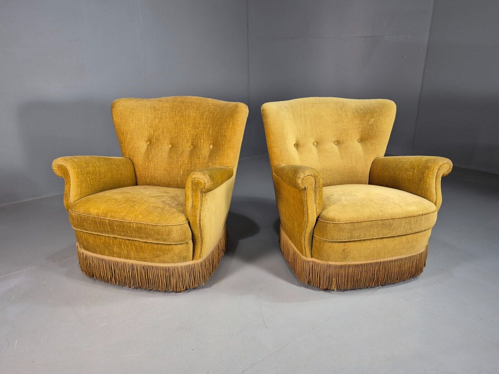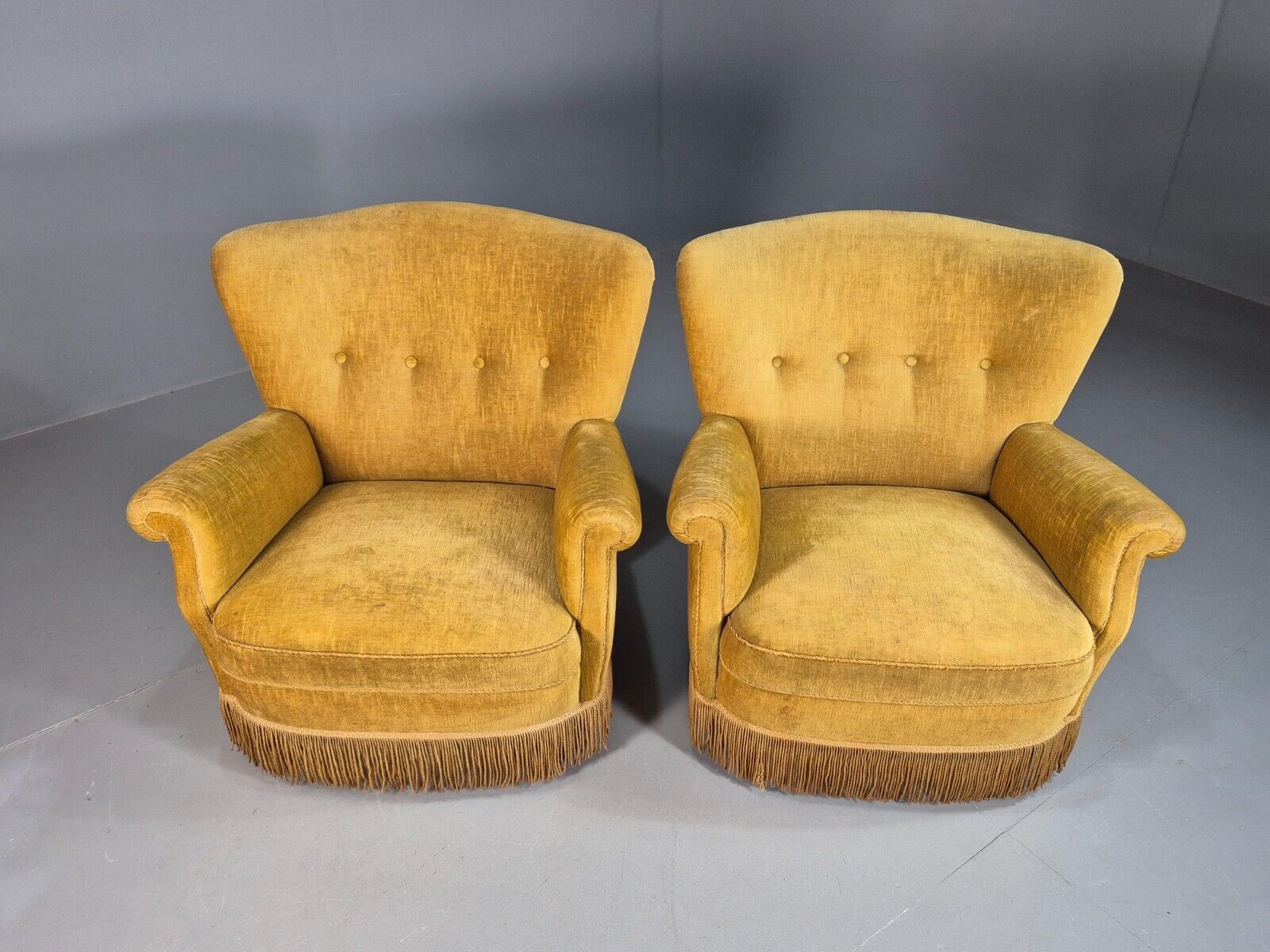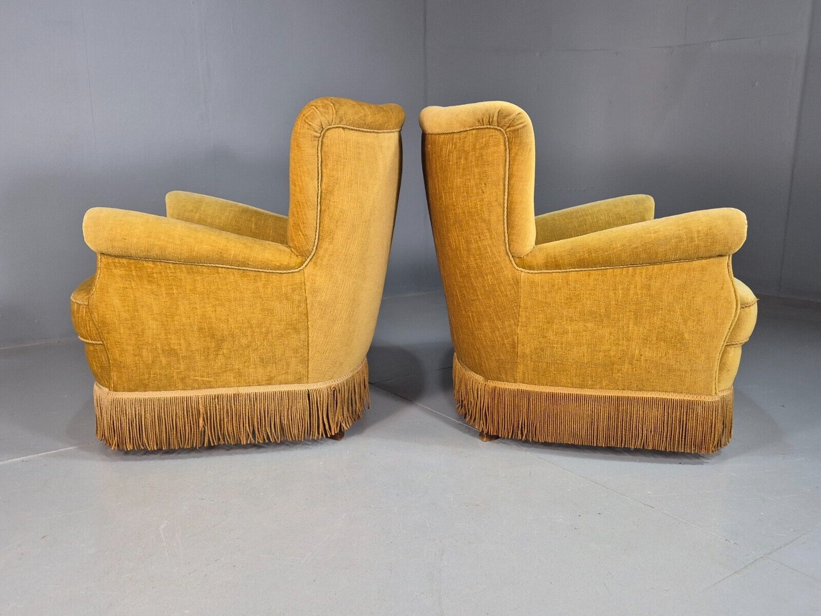 Pair Of Vintage Danish Gold Velour Armchairs Tassels Art Deco Style EB8068 VCLO