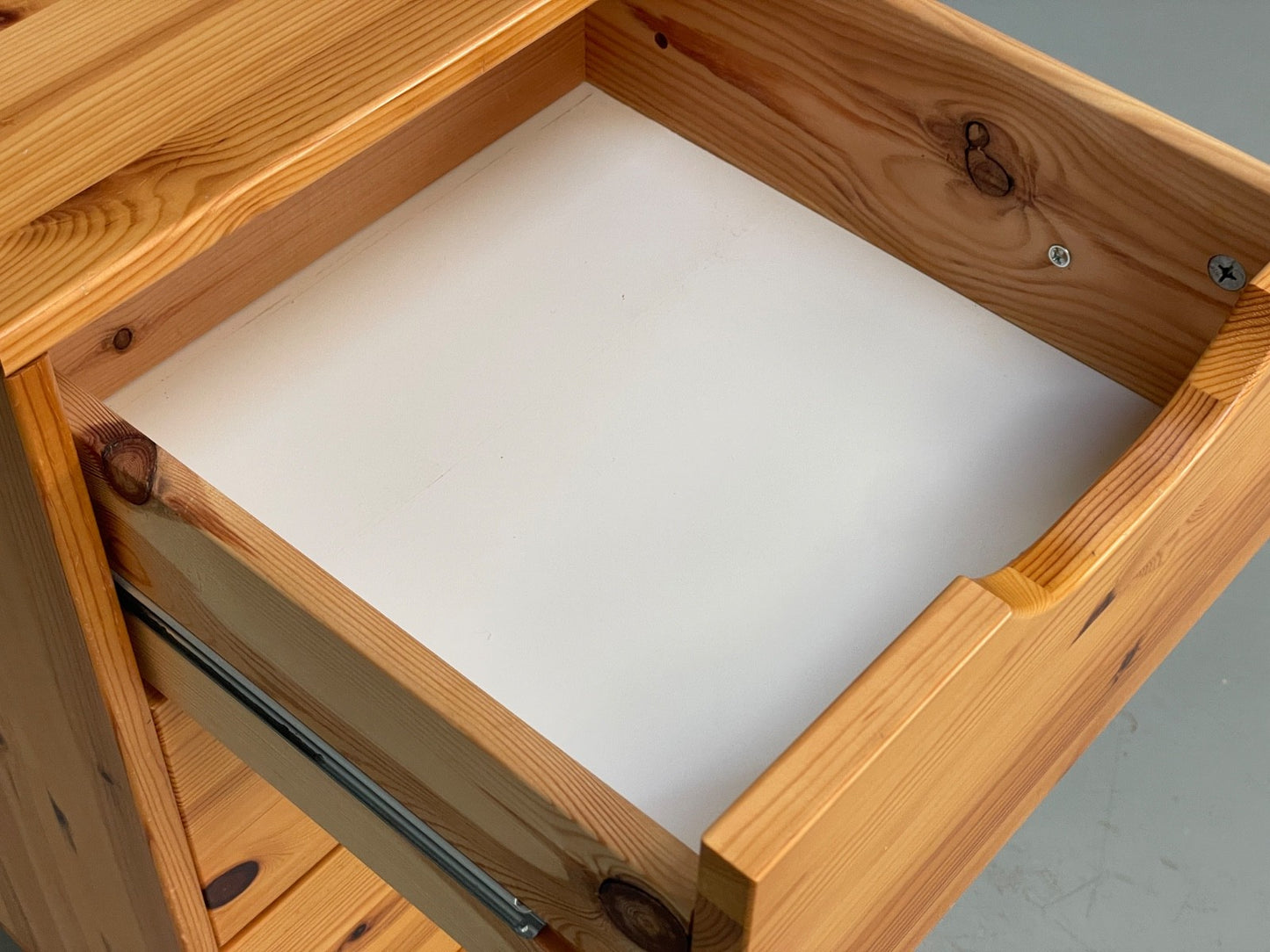 Fair to good condition - There is a gouge / chip on the top pine surface (not too large). There are a few light scuffs and scratches. There are some small filled holes on the sides. The drawers slide well. Overall a nice looking thing with some slight cosmetic marks.