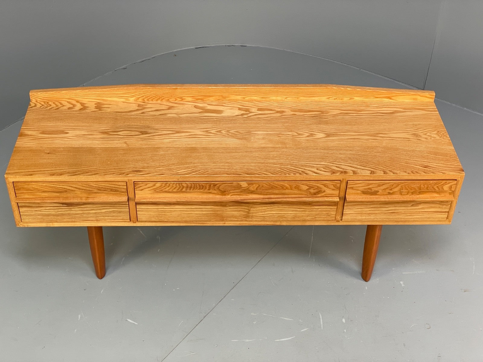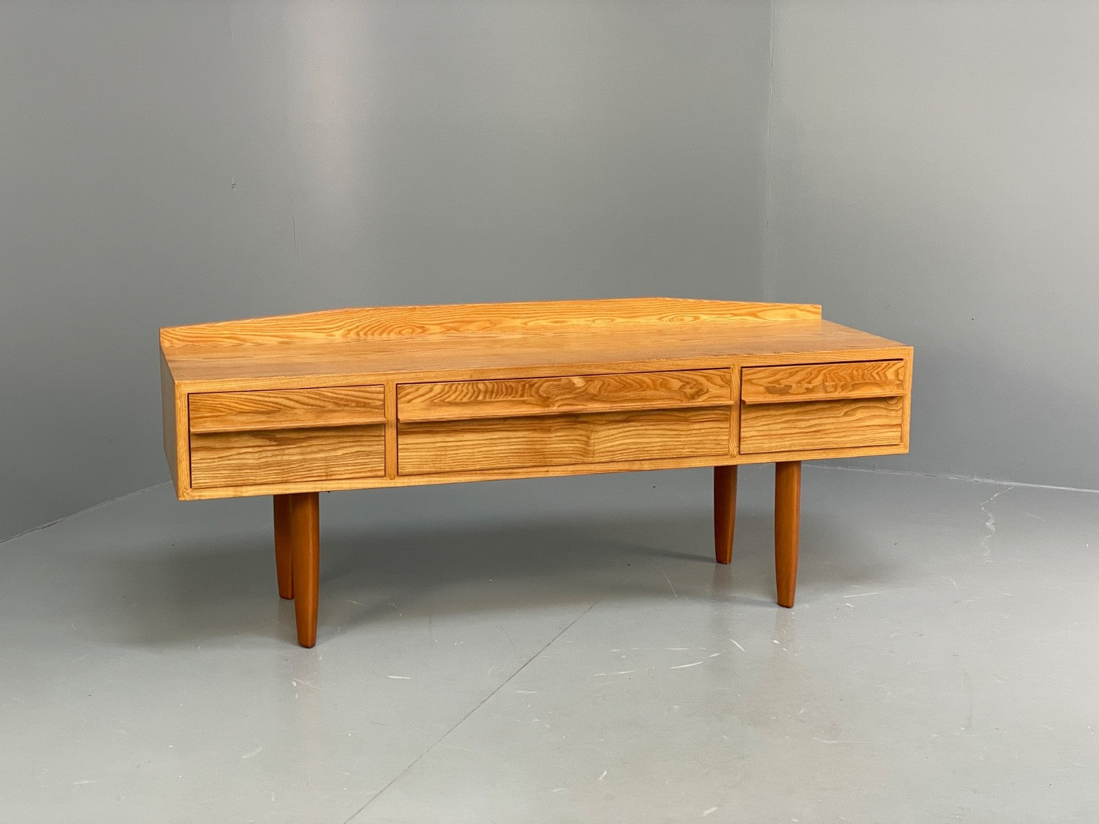 A high quality solid ash media unit or tv stand with removable beech legs. This has a really vibrant grain pattern and is a well made item with lovely thin ash handles on the three drawers. It has removable triangular beech legs added to it