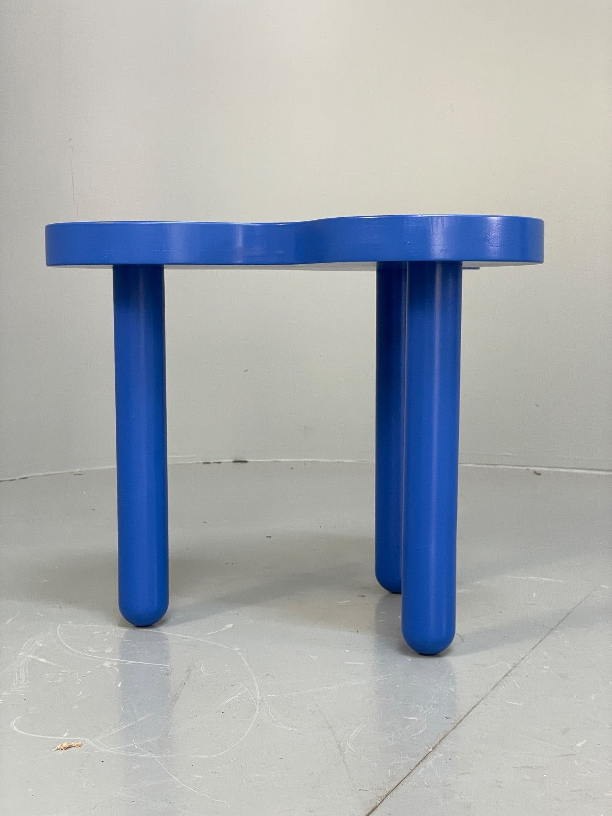 A 'Splat' side table designed by Sophie Collé for Areaware. This is in a great bold primary blue colour and has a fun free form shape. The legs have a nice rounded shape and can be removed if needed. A lovely bit of retro throwback modern design.