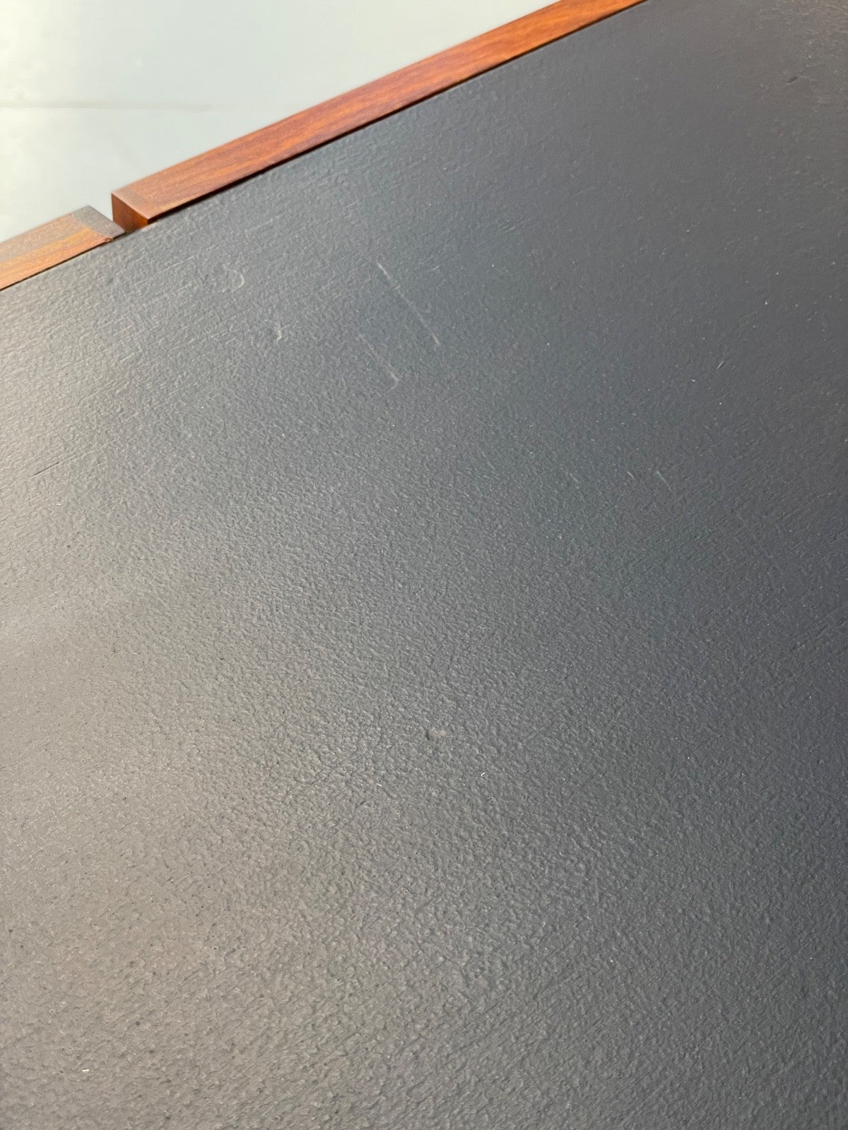 Good condition - The top has been painted a very dark grey-black and is slightly textured with some visible lines underneath where joints were. The front is very clean with no scuffs. There is some sun fading on the sides and a few minor scuffs. There is a minor veneer chip on the left side top. Overall this is a really nice looking and impressive thing.