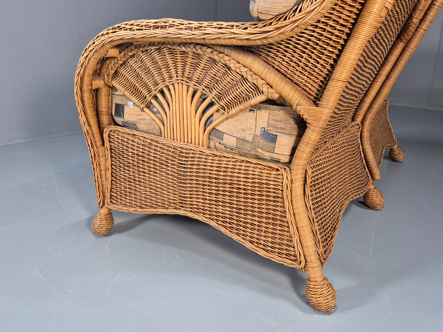 CONDITION: The sofa is in good condition. The wicker frame is in very good order. The fabric has lots of loose threads, see photos. The fabric has heavy sun fade.