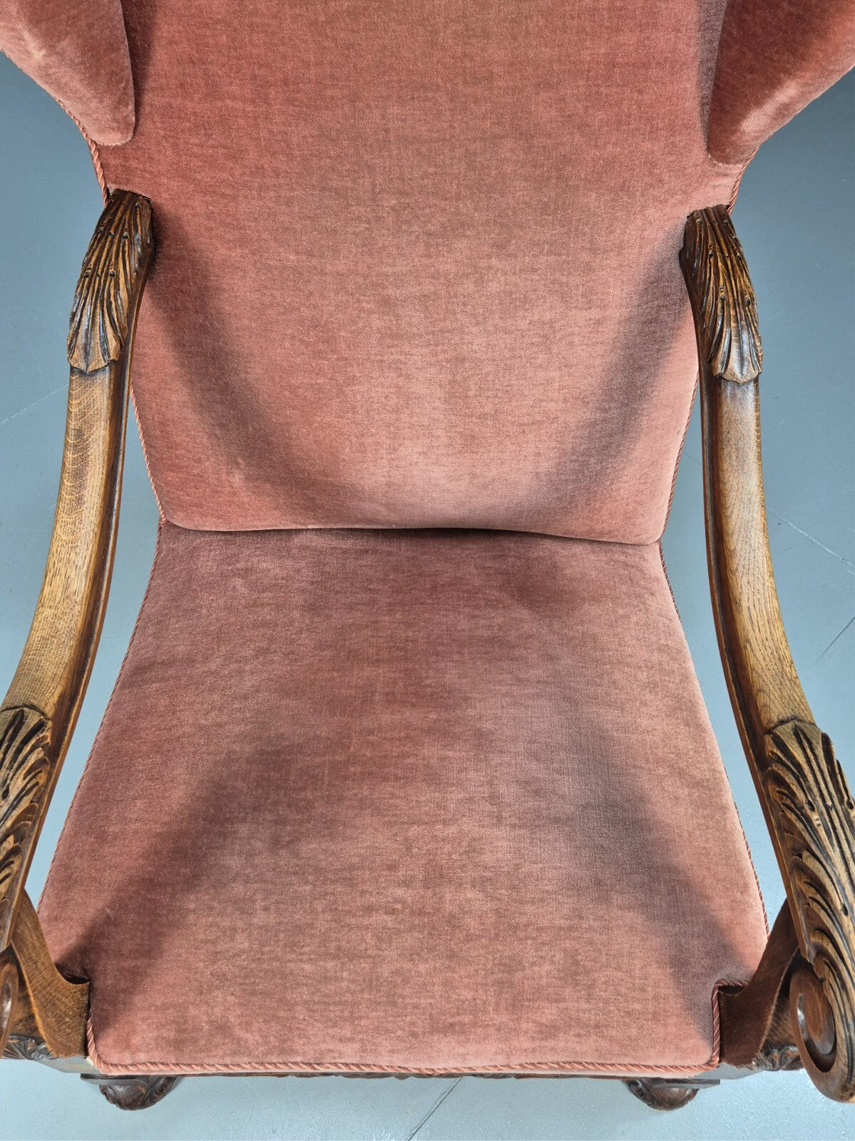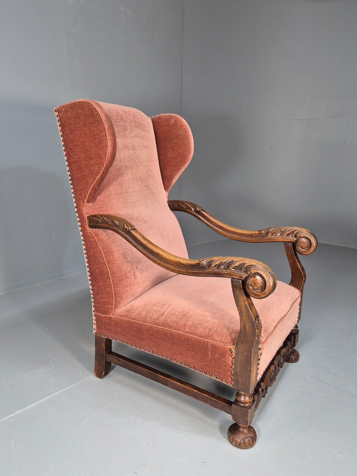 Vintage Danish Lounge Chair Pink Peach Velour Oak 17th Century Style EB8970 VCLO